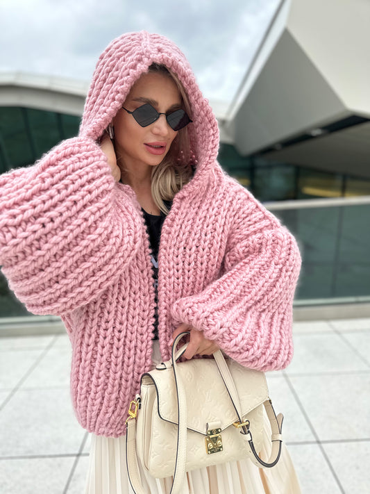 Chunky Knit Hooded Cardigan. Trendy Women Cable Knit Oversized Hand Knitted Jacket