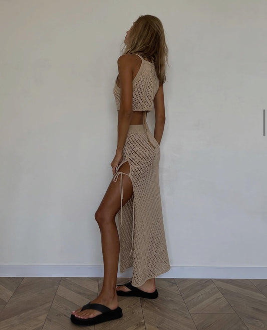 Elegant Crochet Maxi Dress with Open Back & Side Slit — 100% Cotton, Boho Summer Beachwear