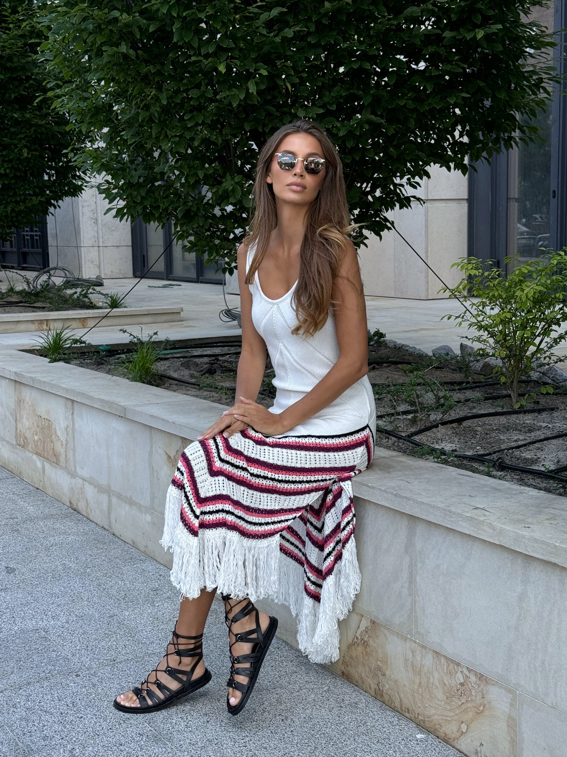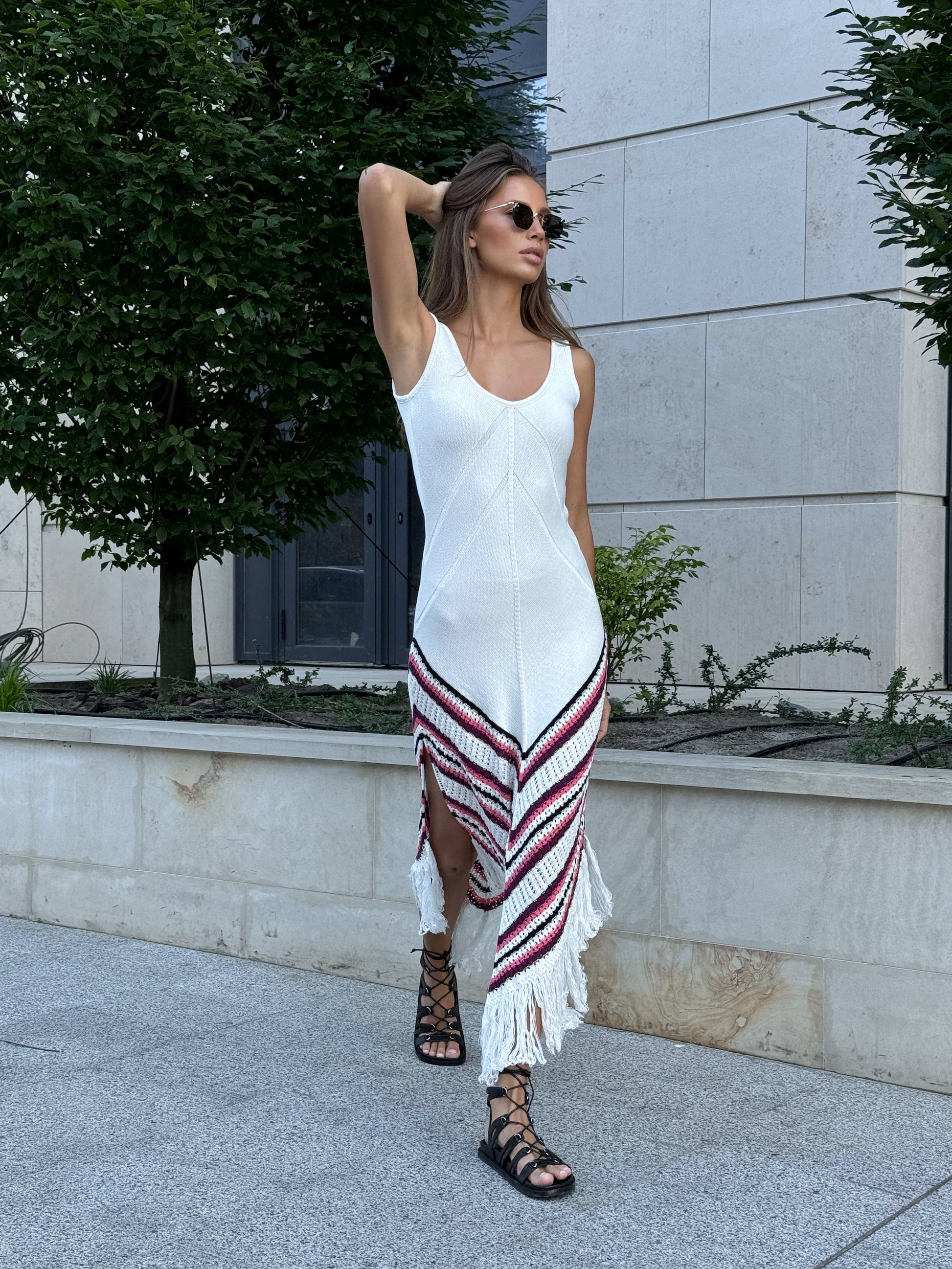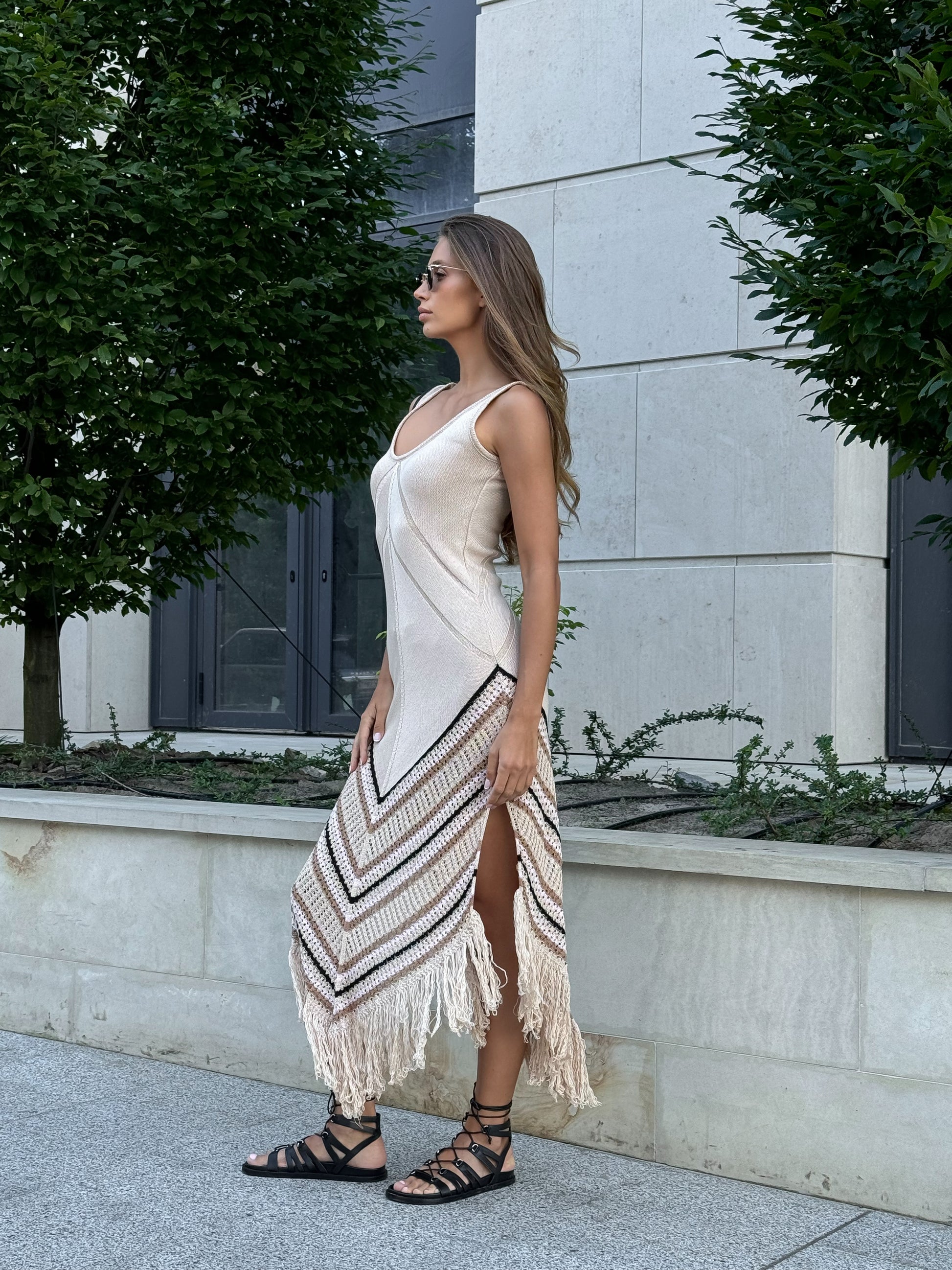 Featuring a soft V-neckline, an elongating chevron-knit pattern, and playful fringe detailing at the hem, this piece adds instant flair to any summer wardrobe. The side slit offers fluid movement and a hint of sensuality, making it perfect for both casual city walks and dancing barefoot at beach parties.