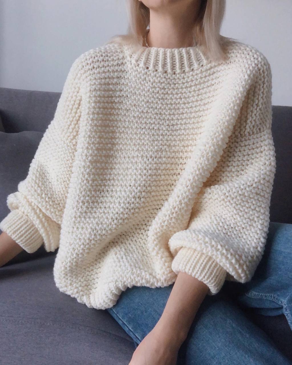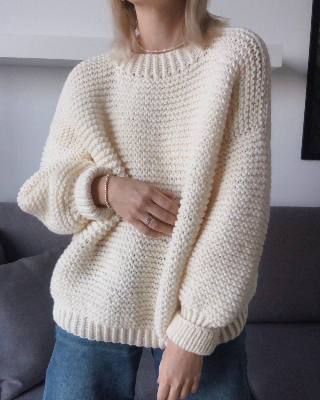 Wrap yourself in cloud-like comfort with this hand-knitted chunky sweater in a soft cream tone. Designed with timeless simplicity in mind, this piece features a classic crewneck, oversized silhouette, and cozy garter stitch texture. Perfect for quiet moments at home or casual outings, it blends everyday comfort with elevated handmade style.