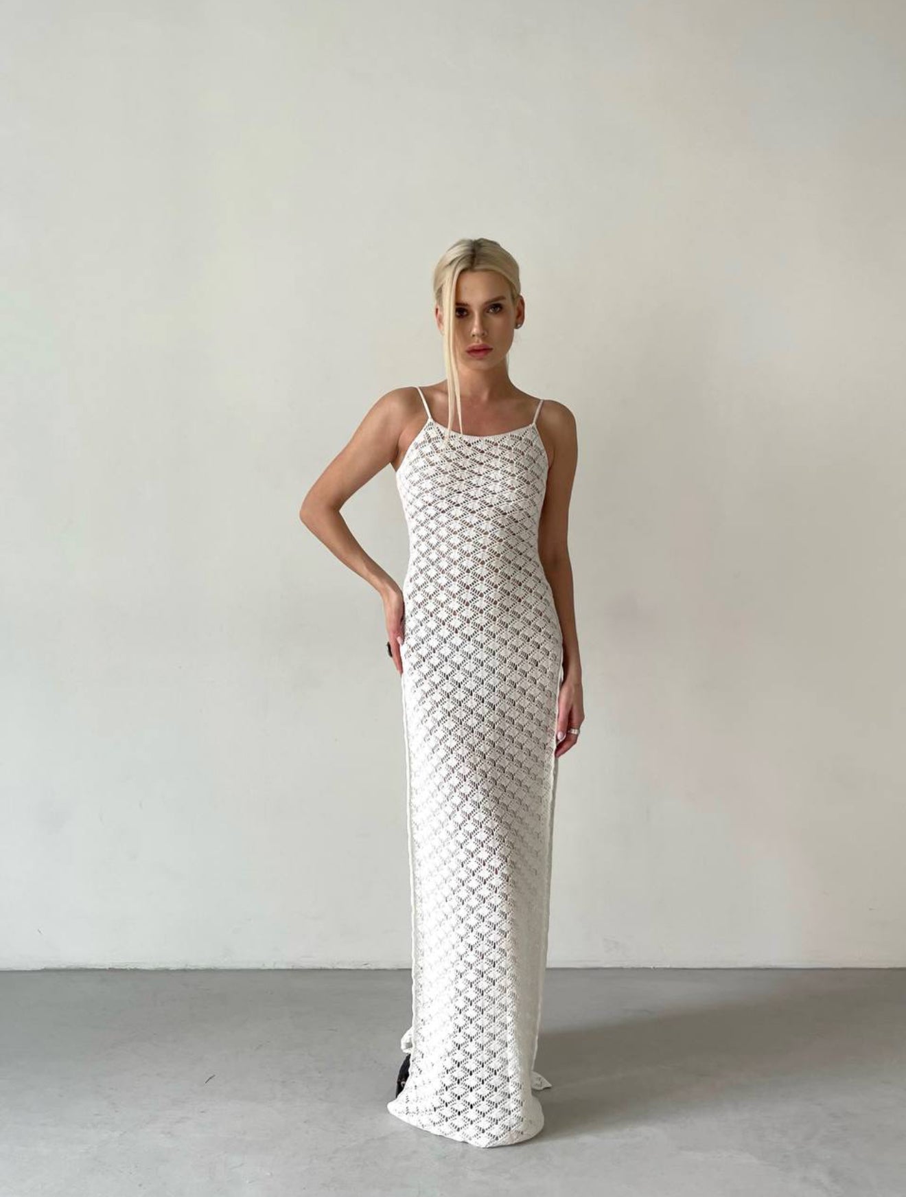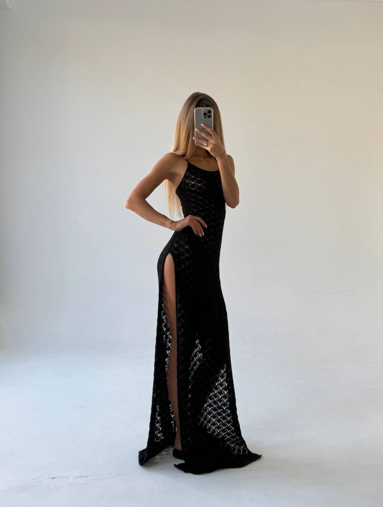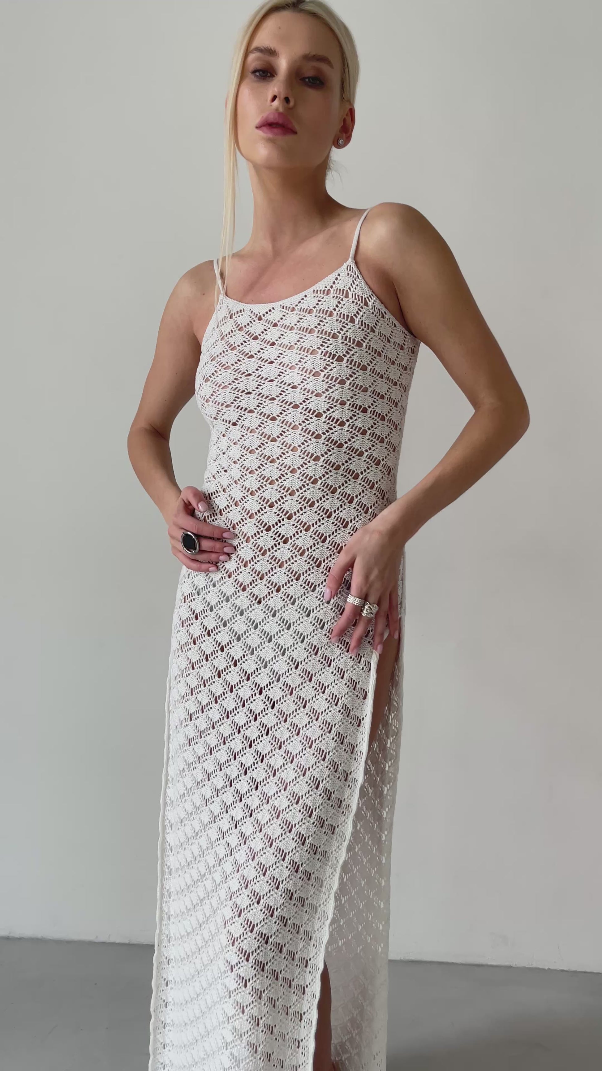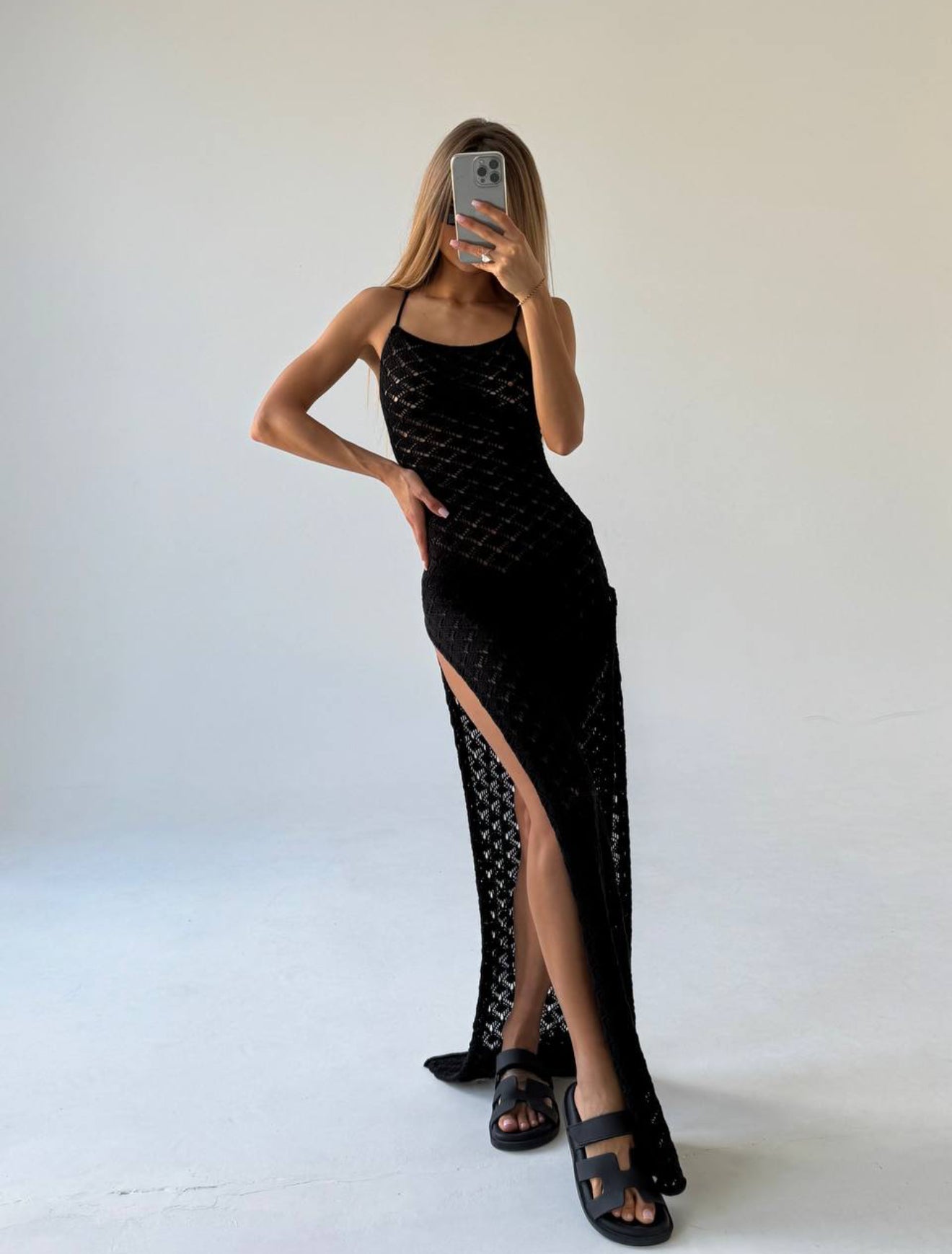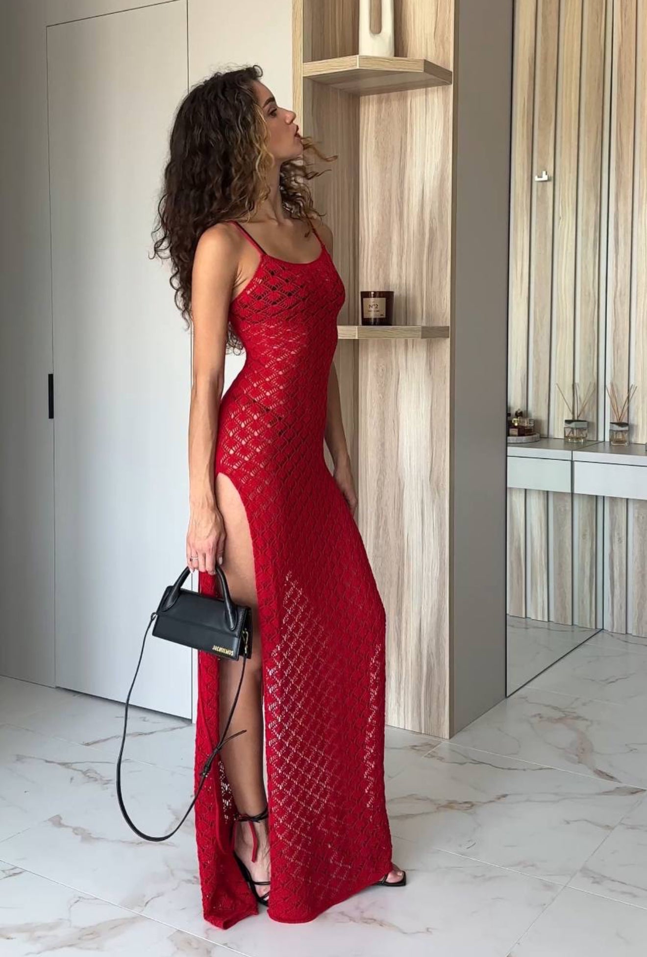 Elevate your wardrobe with this stunning crochet maxi dress, designed for effortless elegance and versatility. Featuring a delicate knit pattern, a figure-flattering silhouette, and a daring side slit, this dress is the perfect blend of sophistication and allure.