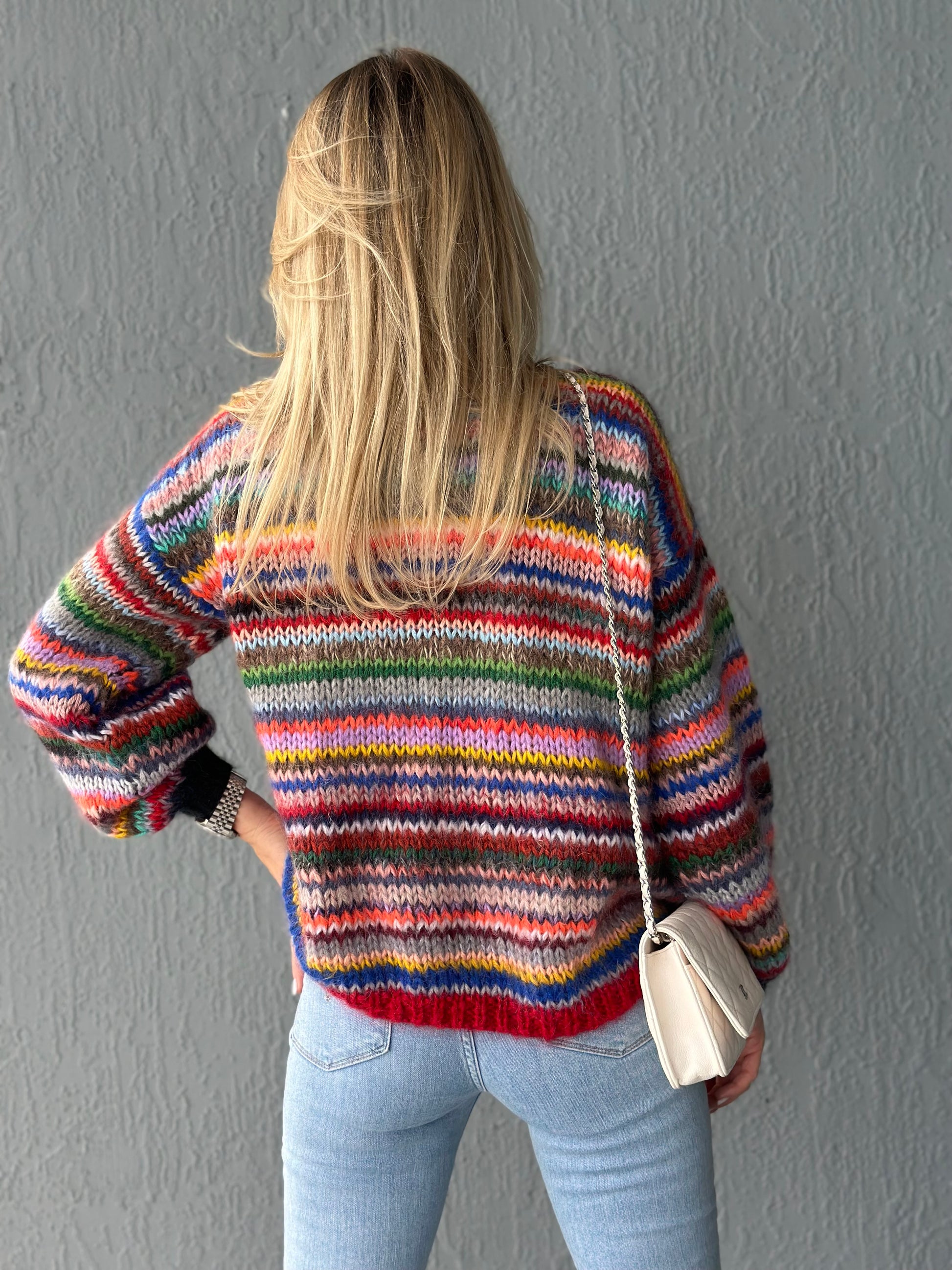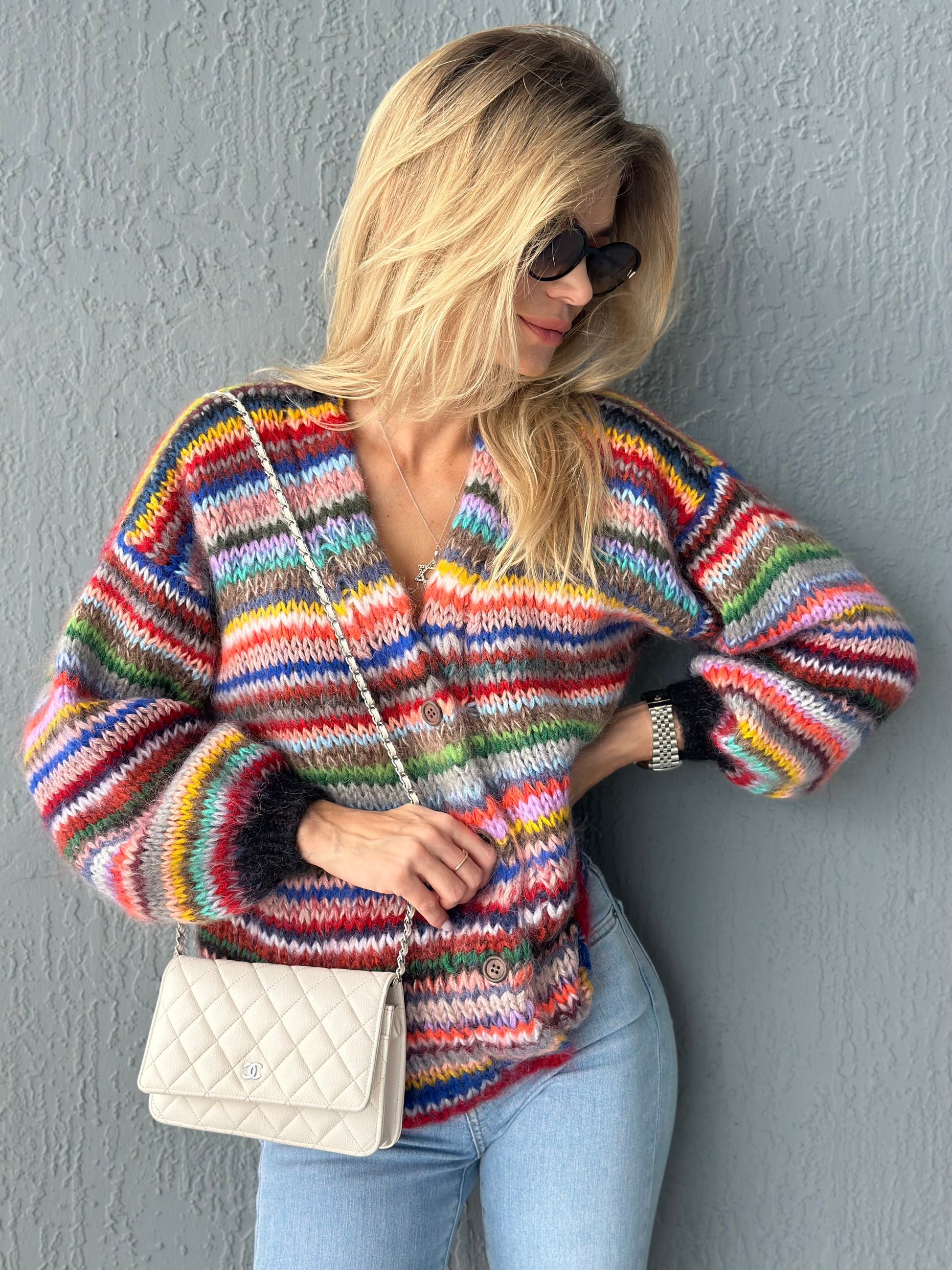 Wrap yourself in elegance with our luxury mohair cardigan, featuring the iconic Mexican stripe pattern. Crafted from ultra-soft, lightweight mohair, this piece offers both warmth and a delicate, airy texture perfect for layering. The vibrant stripes add a chic, artisanal touch, while the relaxed fit ensures effortless comfort and sophistication. Ideal for elevating any outfit, from casual jeans to elegant dresses.