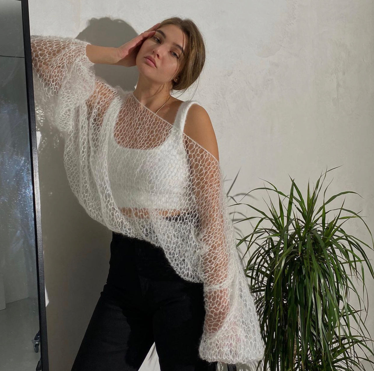See-through Mohair Women Sweater. Bridal Cover-up. Transparent Women Knitted Pullover