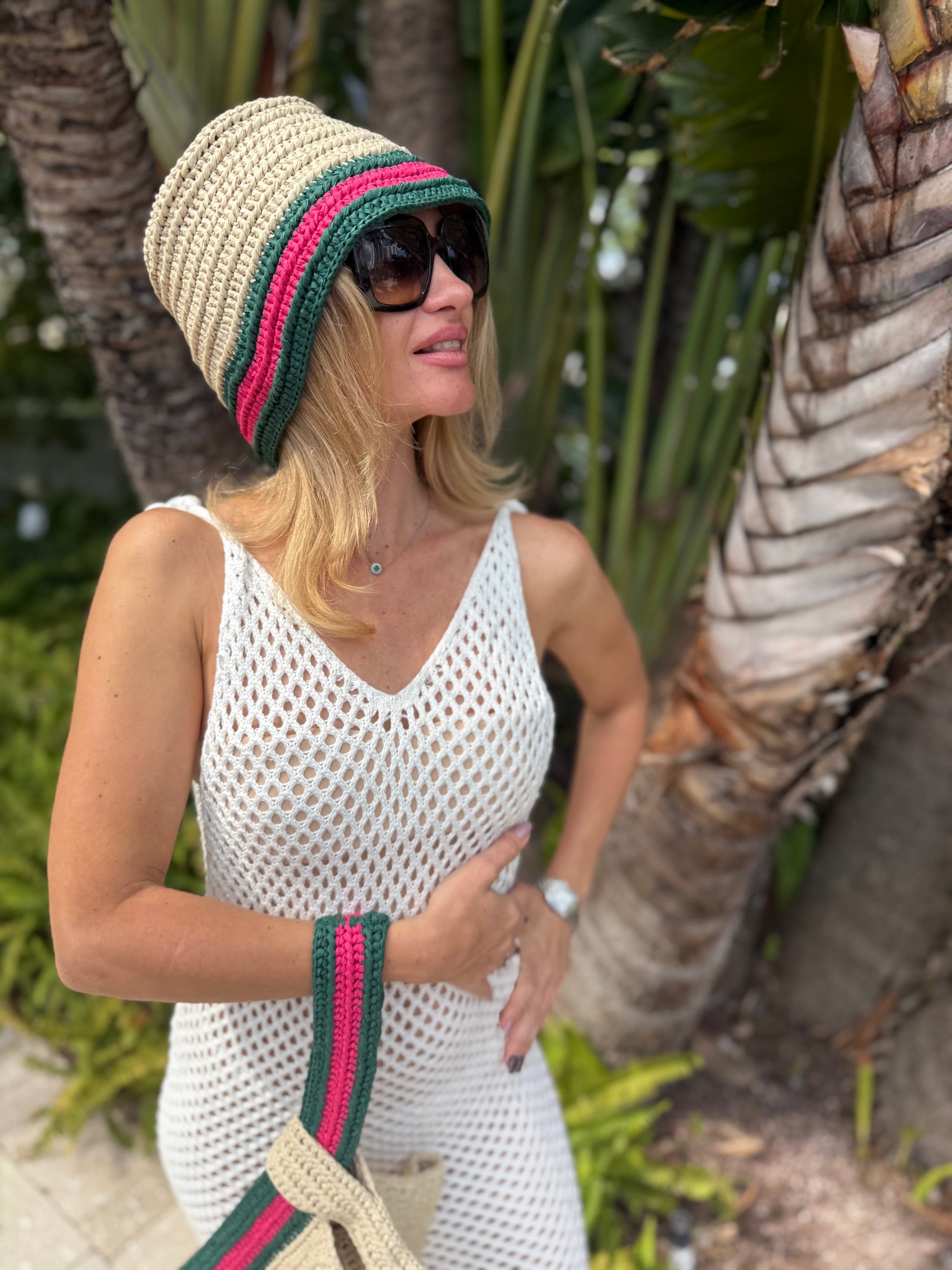 Summer elegance with this exclusive handmade crochet set crafted from natural raffia! This trendy set includes a chic bucket hat and a spacious bag, perfectly complementing each other.