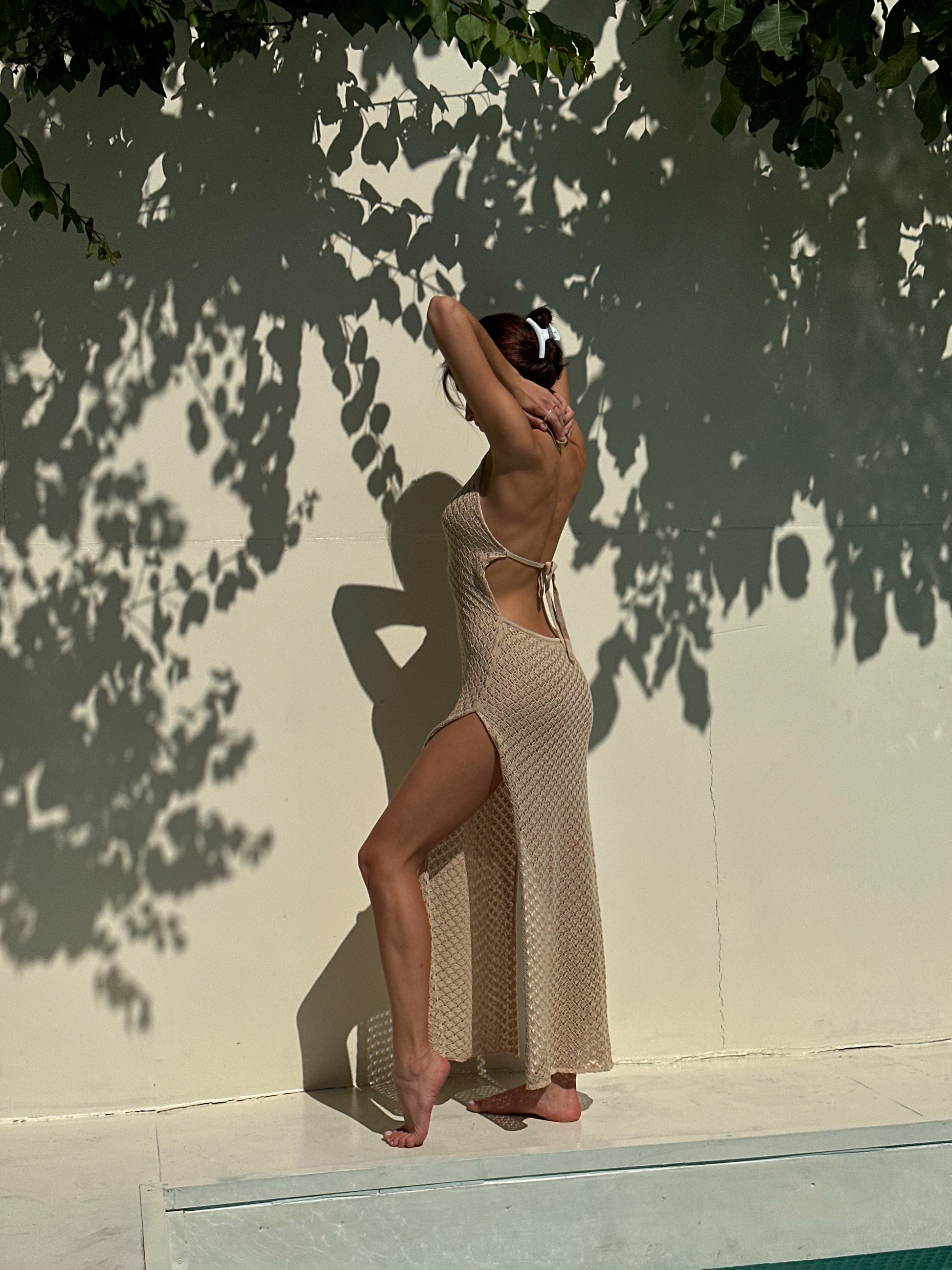 Breezy halter-style open-knit beach dress in sand tone. 100% cotton, breathable and semi-sheer — the perfect summer layer over your bikini or swimwear.